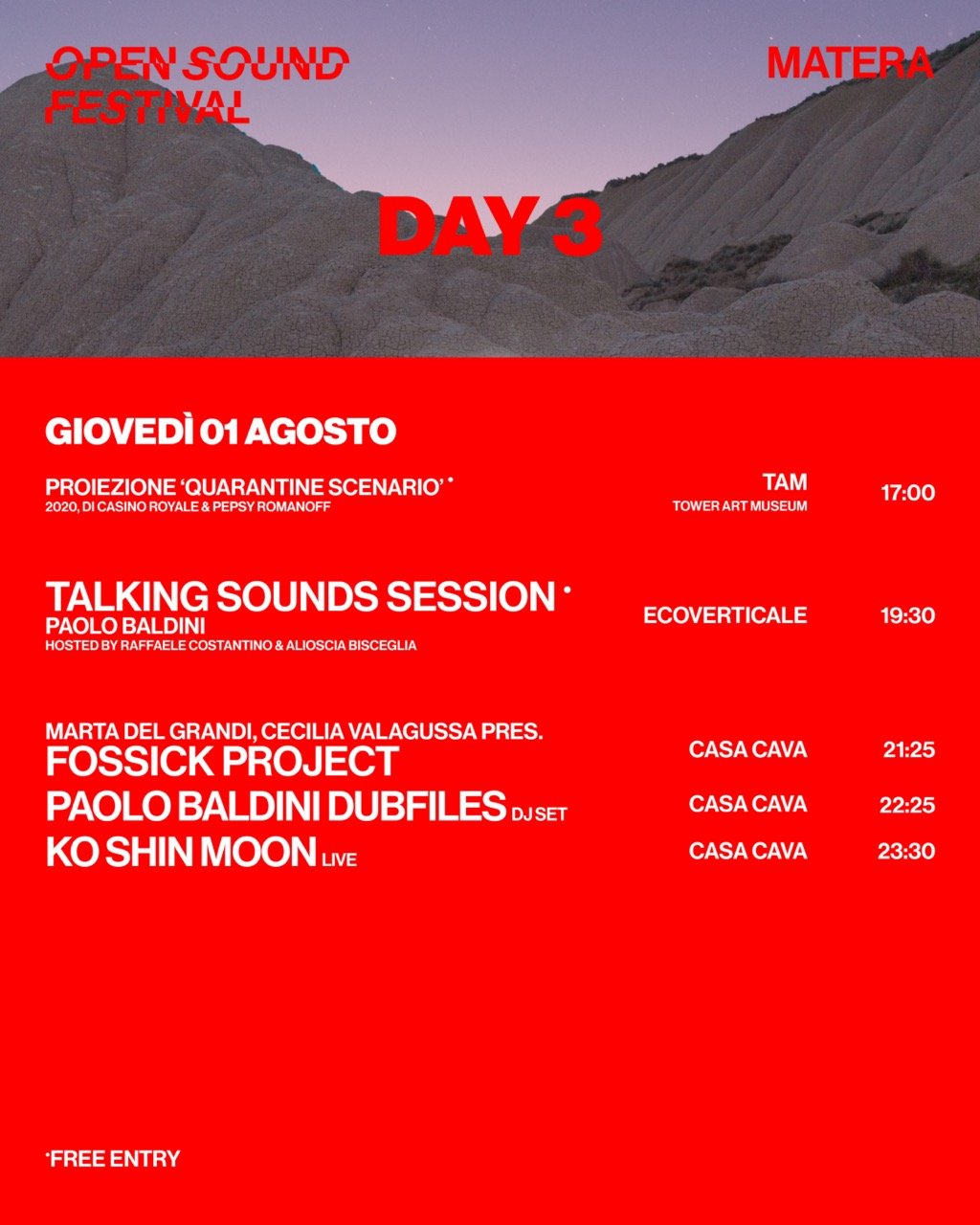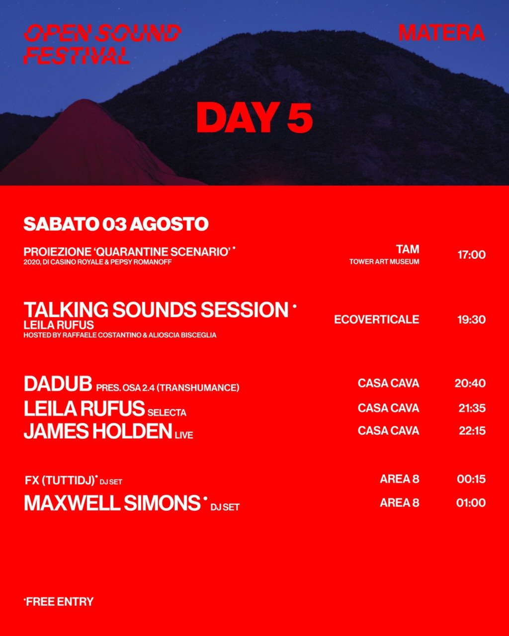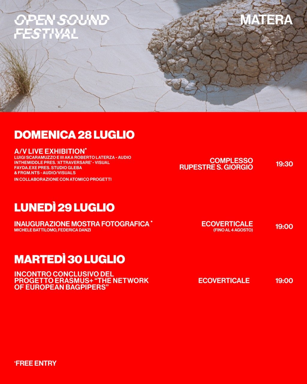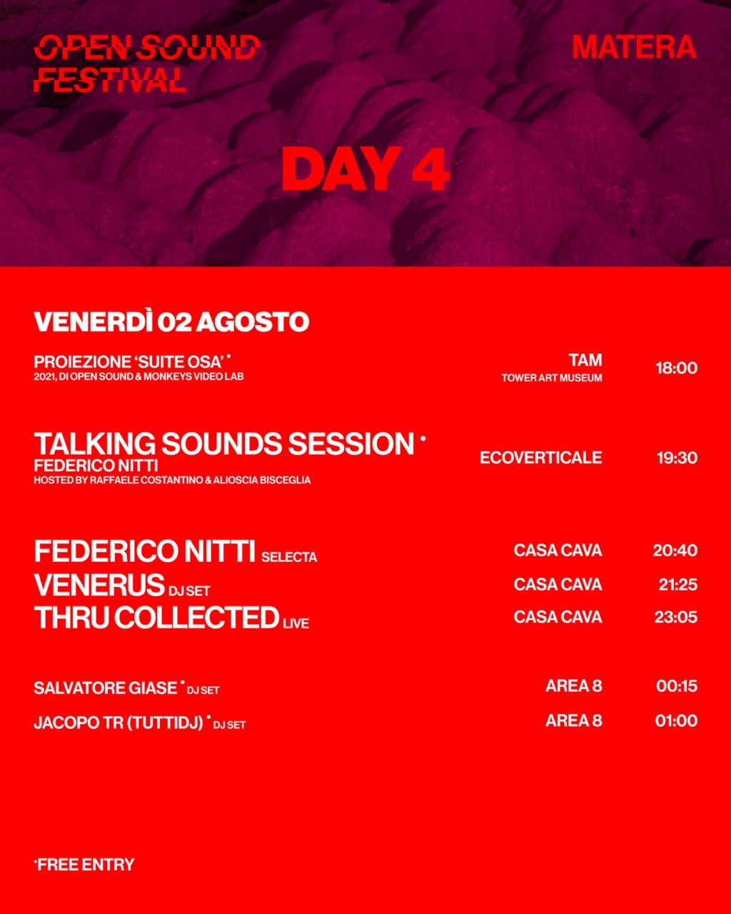 Dal 27 luglio al 3 agosto torna a Matera e nel Parco Nazionale del Pollino, Open Sound Festival: un boutique festival in due location uniche e immersive, che dalla Basilicata guarda al suono di domani. Open Sound Festival 2024 ospita le avanguardie della scena euromediterranea incarnando e raccontando l’idea di Land Music Experience ossia un’indagine sul paesaggio e sui territori fatta attraverso il suono, i ritmi e riti ancestrali che si rivelano pregni di futuro. Lo dimostra una lineup di artiste e artisti che amano intraprendere strade sonore inesplorate, con la direzione artistica di Alioscia Bisceglia.